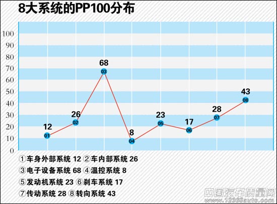奇瑞E5的故障量最高的系統(tǒng)是電子設(shè)備系統(tǒng),PP100數(shù)值為68,高出次之的轉(zhuǎn)向系統(tǒng)25。從車主的反饋中我們得知,三成多車輛在電子設(shè)備及附件方面出現(xiàn)過故障(導(dǎo)航故障等),還有一成多車輛傳動(dòng)系統(tǒng)出過故障(變速箱異響等)。不過,奇瑞E5的溫控系統(tǒng)故障數(shù)較低,也鮮有車主提出該方面的質(zhì)疑。