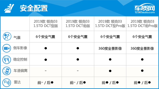2019款領(lǐng)克03全系車型的配置差異主要集中在主動安全和座椅配置方面,兩款高配的Pro版車型增加了并線輔助、車道偏離預(yù)警、車道保持輔助、交通標(biāo)識識別、主動剎車以及疲勞駕駛提示等全套的主動安全系統(tǒng),提供更周到細(xì)致的安全防護(hù)。此外,Pro版車型還升級為360度全景影像和全速自適應(yīng)巡航系統(tǒng),并配備了倒車車側(cè)預(yù)警、自動泊車、自適應(yīng)遠(yuǎn)近光燈等先進(jìn)科技配置,多媒體部分則搭載了10個(gè)揚(yáng)聲器的Infinity燕飛利仕高級音響系統(tǒng),還配備了較為實(shí)用的原廠行車記錄儀和手機(jī)無線充電功能。相比較而言,兩款勁版車型只是在外觀設(shè)計(jì)以及內(nèi)飾用料方面有所區(qū)別,比如增加了外觀運(yùn)動套件,座椅采用了質(zhì)感更好的皮與翻毛皮混搭的材質(zhì)。
