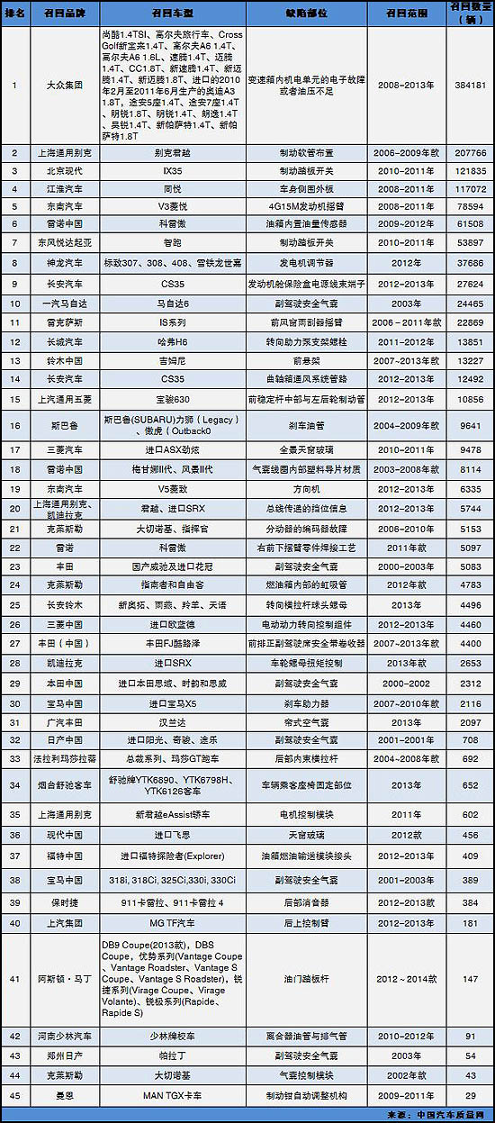 2013年上半年,受到《缺陷汽車產(chǎn)品召回管理條例》及3.15的雙重壓力,國家質檢總局在國內共進行召回45次,其中家用車輛召回42次。累計臺次達1274722輛,涉及18個進口品牌,14個合資品牌及8個自主品牌。其中雷諾、克萊斯勒品牌出現(xiàn)的頻率最高,而大眾的召...