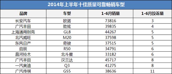 2014年上半年十佳質(zhì)量可靠暢銷車型推薦