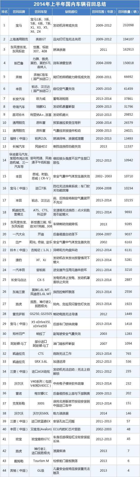 2014年上半年,國(guó)內(nèi)汽車企業(yè)共召回汽車數(shù)量達(dá)到114萬(wàn)余輛,共實(shí)施汽車召回44次,涉及30余個(gè)品牌的近70款車型,同去年相比,總量平穩(wěn)。其中、投訴更多的集中在日系、美系、德系品牌中,主要為安全氣囊及發(fā)動(dòng)機(jī)相關(guān)缺陷所致。而上半年只有長(zhǎng)安和長(zhǎng)城汽車...