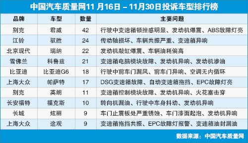 中國(guó)汽車(chē)質(zhì)量網(wǎng)2012年11月下半月投訴排行