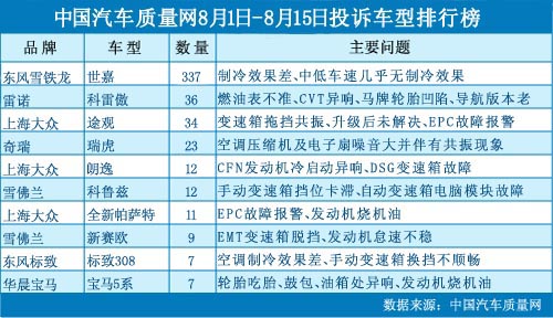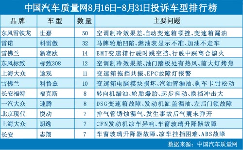 中國汽車質(zhì)量網(wǎng)2012年8月下半月投訴排行