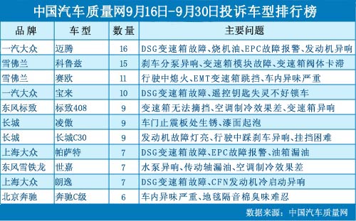 中國汽車質(zhì)量網(wǎng)2012年9月下半月投訴排行