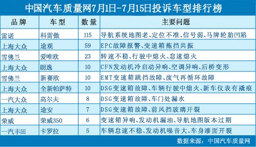 在本時間段內(nèi)(2012年7月1日~15日),中國汽車質(zhì)量網(wǎng)(www.dysfly.cn)接到消費者針對汽車產(chǎn)品的投訴總計621宗,共涉及140款車型,相比6月下半月均有所上升。 雷諾科雷傲因?qū)Ш絾栴}二度榜首 在2012年6月下半月投訴排行榜中,雷諾科雷傲因原廠所配...