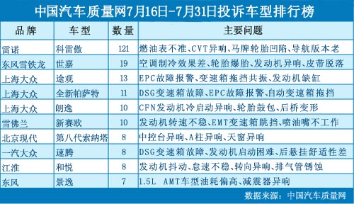 在本時間段內(nèi)(2012年7月16日~31日),中國汽車質(zhì)量網(wǎng)(www.dysfly.cn)接到消費者針對汽車產(chǎn)品的投訴總計500宗,共涉及124款車型,兩項數(shù)據(jù)相比7月上半月均有所下降。 雷諾科雷傲油表顯示不準(zhǔn)導(dǎo)致集體投訴 繼馬牌輪胎及TOMTOM導(dǎo)航之后,雷諾科雷...