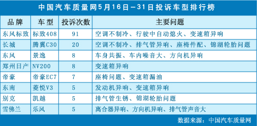 中國汽車質(zhì)量網(wǎng)5月下半月投訴車型排行榜
