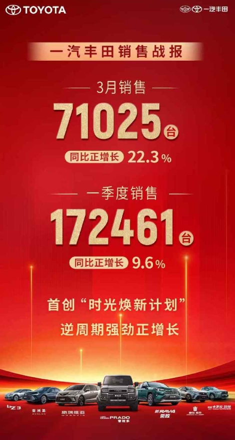 4月1日,一汽豐田官方微博公布的最新銷售數(shù)據(jù)顯示,今年3月一汽豐田銷量達(dá)71025臺(tái),同比增長(zhǎng)22.3%。今年一季度銷售172461臺(tái),同比增長(zhǎng)9.6%。