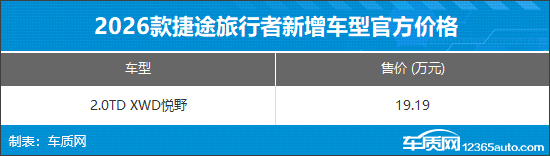 日前,車質網從官方獲悉,2026款捷途旅行者新增加一款2.0TD XWD悅野車型,售價為19.19萬元。從車型信息來看,新車是燃油版本的頂配車型,配置上進行了相應調整,動力則依舊搭載2.0T+7DCT動力組合,并配備XWD四驅系統(tǒng)。